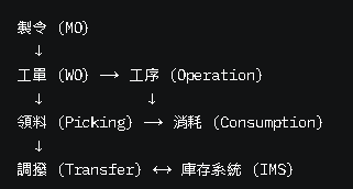 製令是生產的總計畫,定義需要生產的產品、數量與時程,是PMS的核心指令。 - 關係: