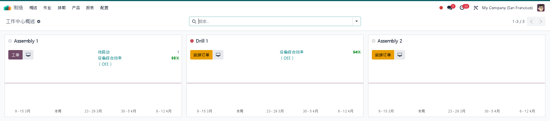 - 生產線:線1、線2、線3(製造 > 配置 > 工作中心)